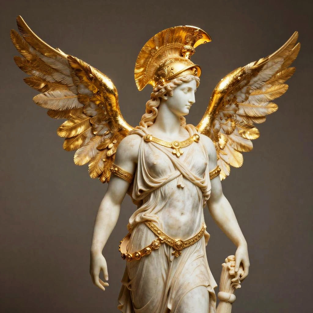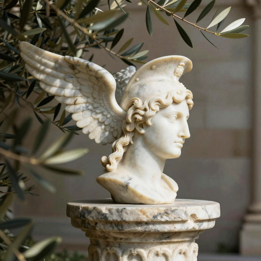 Hermes winged helmet resting on ancient stone pedestal, surrounded by olive branches, marble texture, subtle rays of sunlight highlighting the delicate wings