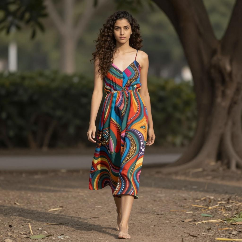 Photorealistic image of a young woman with long curly brown hair and brown eyes walking barefoot outdoors on a tree-lined street. She is wearing a sleeveless, multicolored dress with a leaf pattern, featuring bare arms and shoulders. The background is softly blurred with natural lighting and visible shadows.