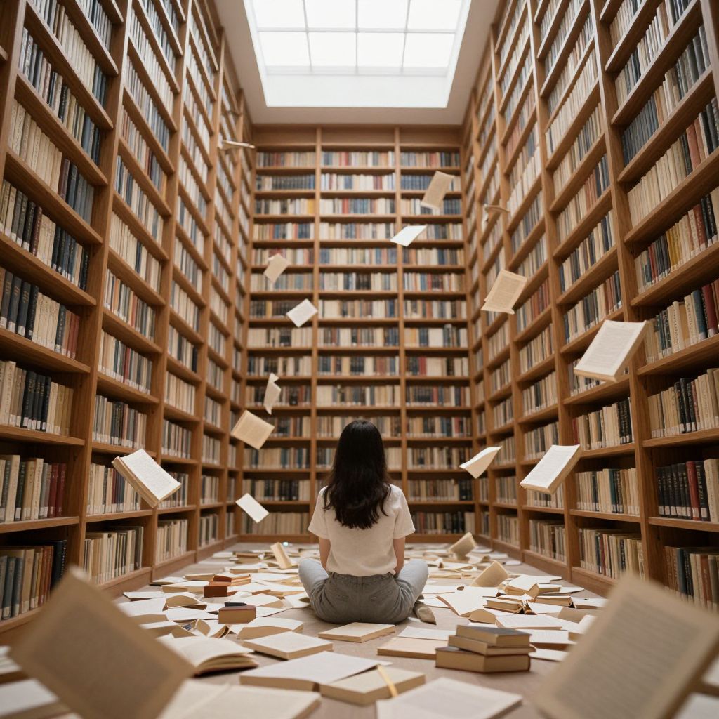 Books float weightlessly in a vast library, cascading from towering wooden shelves as a young woman sits serenely amidst the swirling chaos, her back turned to the viewer, surrounded by a sea of falling pages under a skylit ceiling.