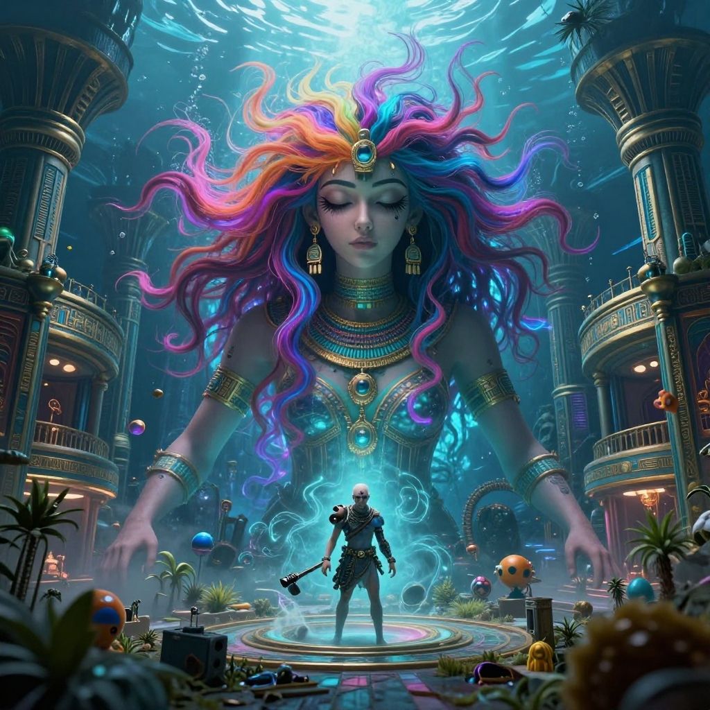 (otherworldly, otherworldly atmosphere, otherworldly appearance), highly insanely detailed, masterpiece, top quality, best quality, highres, 4k, 8k, RAW photo, ((ancient egyptian theme:1.2)), (mystical theme), mystical gatmosphere, arcane sanctuaries, otherwordly aura, (long_hair, long hair, random colors hair, glowing hair, hair over one eye, long messy hair), (eyelashes, eyeliner, eyeshadow, eyelashes, long eyelashes), collar, earrings, jewelry, necklace, armlet, tentacle, (underwater), nsfw, Homestay, Resort, Guest House, building, structure, still life, swirling energy, action pose, drunk, closed eyes, abandoned building, shopping mall, overgrown with vegetation, [volumetric fog], cinematic lighting, colorful, 1girl, sanakan, original, tsutomu nihei, bald, exterminator, forehead mark, arm cannon, GBEAC, (fantasy world)