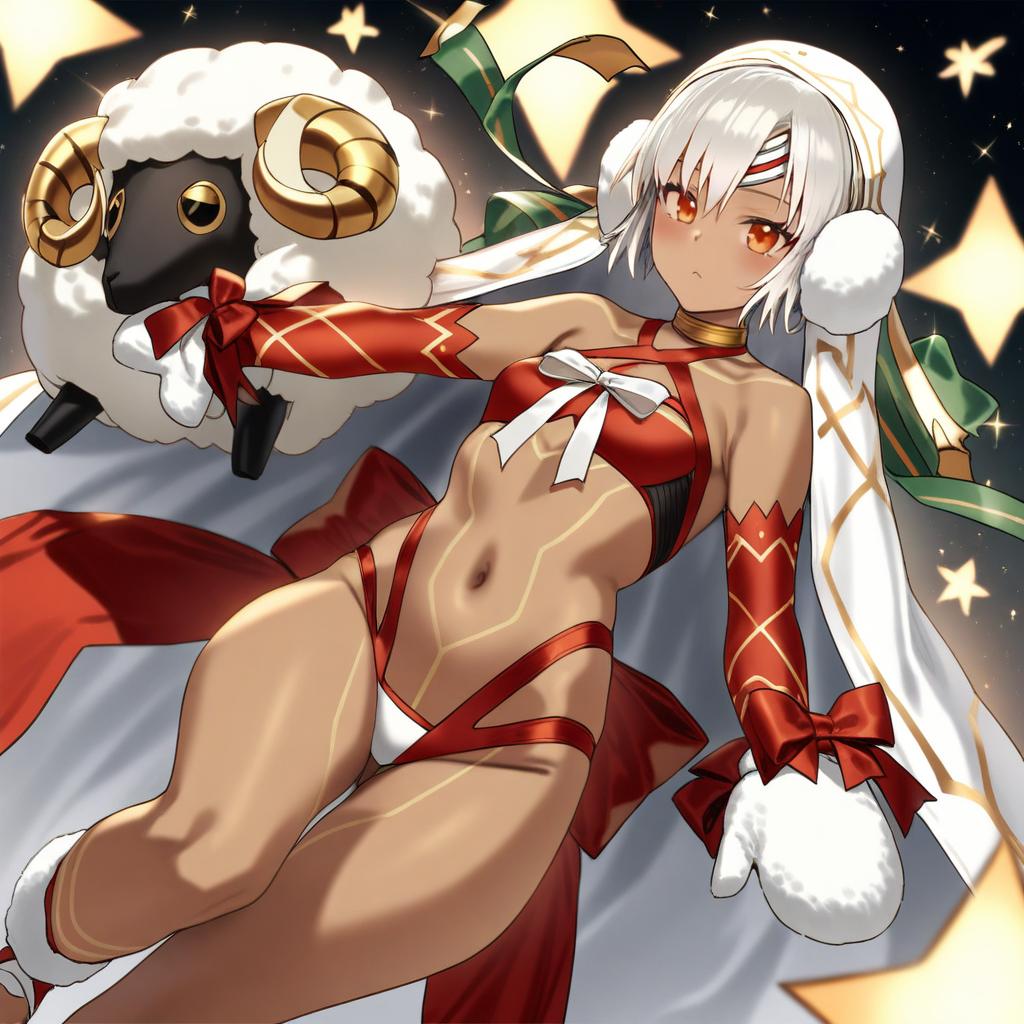 Altera the santa (fate), fate (series), 1girl, dark-skinned female, red eyes, short hair, white hair, small breasts, thighs, navel, full-body tattoo, collarbone, veil, bare shoulders, detached sleeves, choker, sheep, earmuffs, mittens, white mittens, by artist houtengeki, animagine