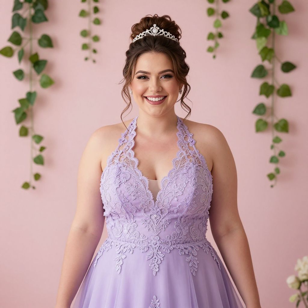 Photograph of a smiling plus-sized woman with fair skin and dark brown hair in an updo, wearing a silver tiara. She is dressed in a lavender lace wedding gown with a deep V-neck and halter straps, showcasing her full breasts. The dress has intricate lace patterns over the bodice and flows into a soft, full skirt. Green ivy garlands hang in the background against a pale pink wall, adding a natural touch. The image has a soft, romantic aesthetic, and the woman's bright smile and confident pose convey joy and elegance.