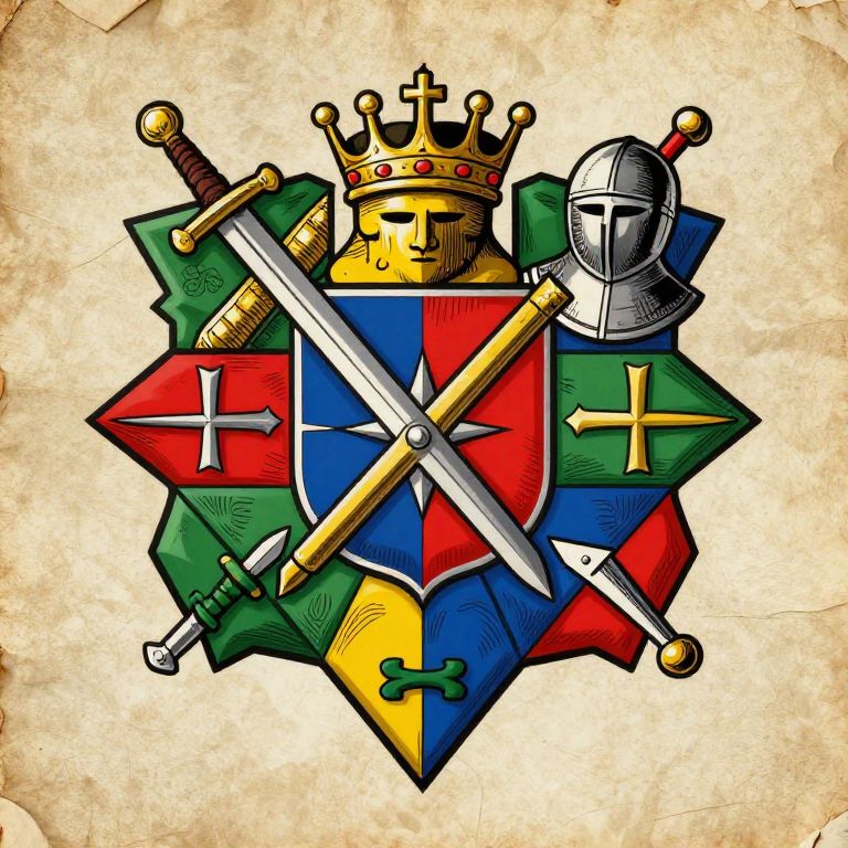 Colorful medieval heraldic crest with a golden crown, crossed swords, and armored helmet, set against a parchment background with colorful shield sections. Digital illustration