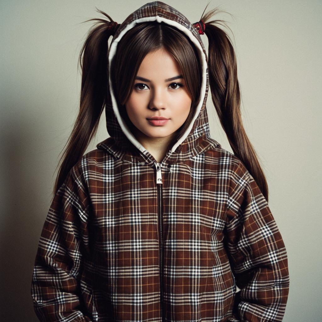 Plaid munchkin costume,1girl, solo, hood, twintails, brown hair, looking at viewer, arms at sides, long hair, hood up, closed mouth, plaid, standing