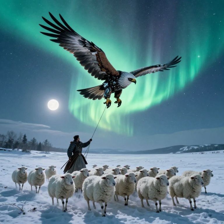 A lone rider clad in armor commands a mechanical hawk, soaring above a luminous aurora, as they herd a flock of ethereal white sheep across a snowy landscape bathed in moonlight.