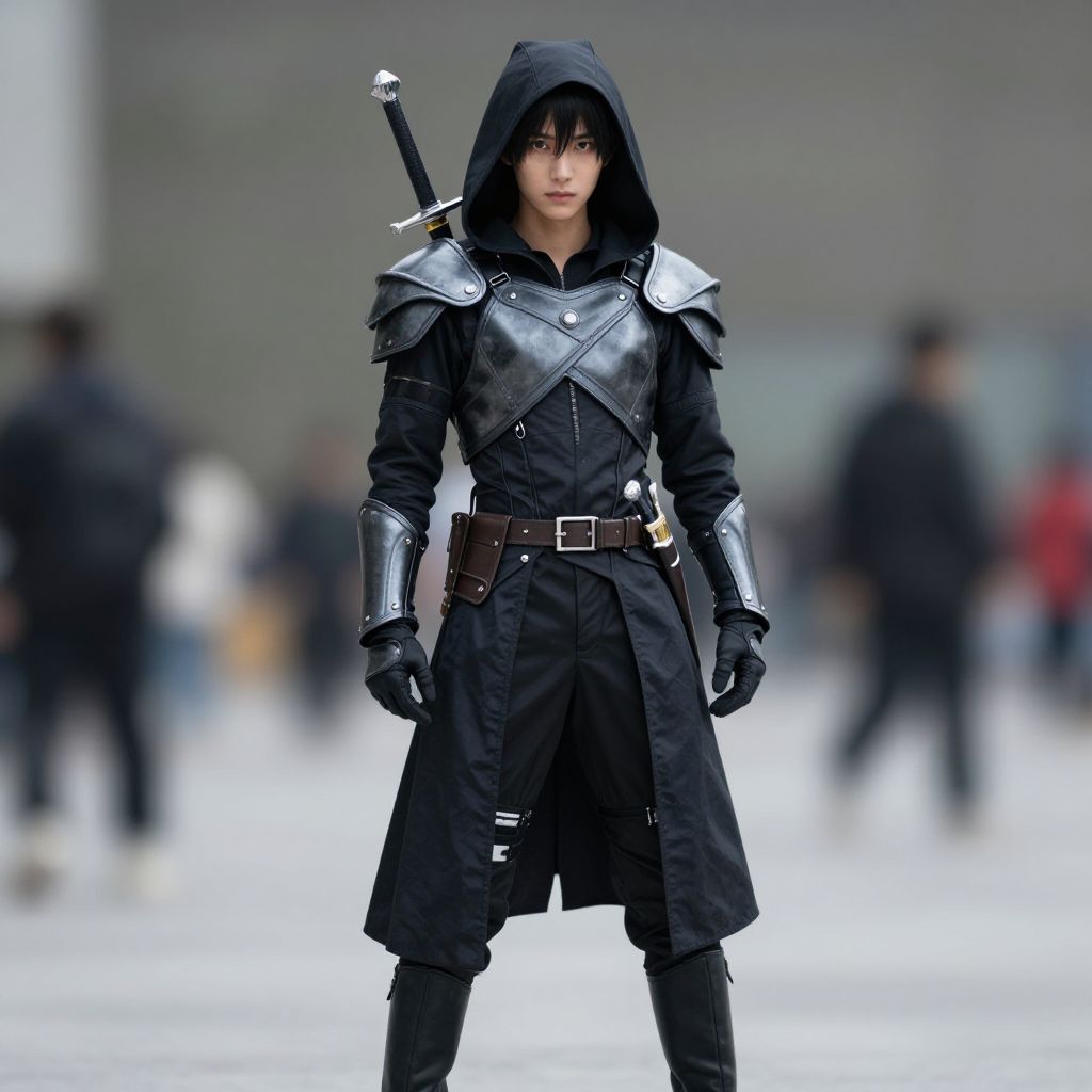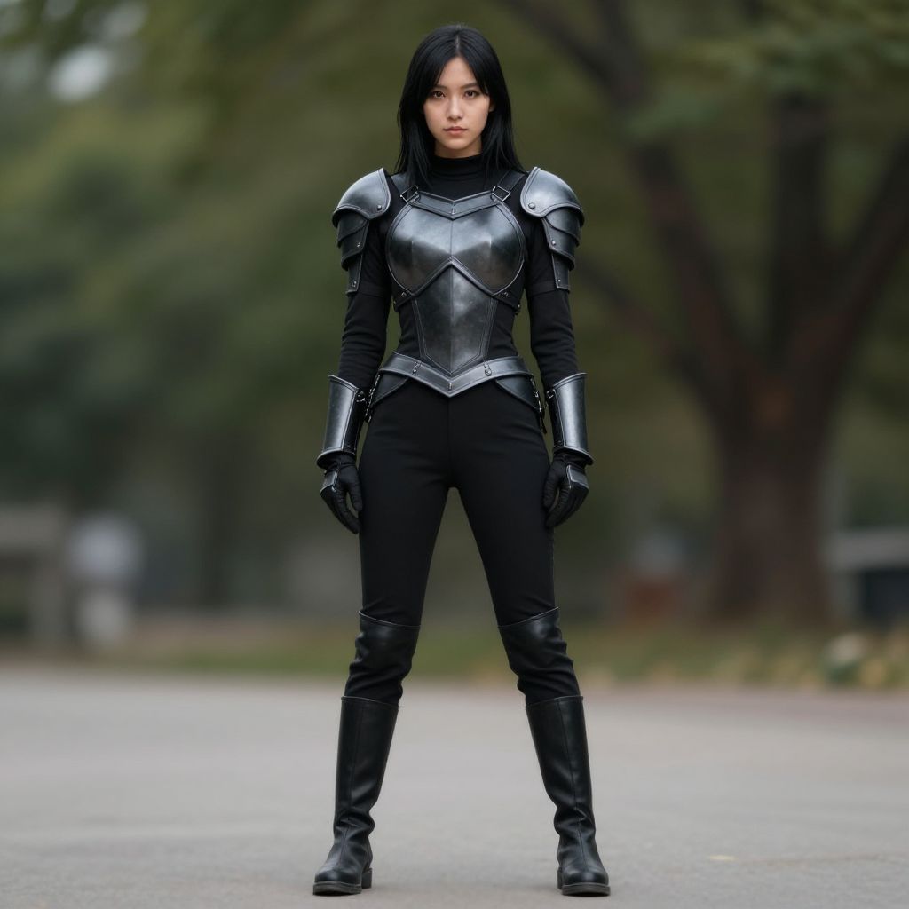 "black boots costume, armor, outdoors, blurry, tree, blurry background, gloves, arms at sides, boots, looking at viewer, standing, 1girl, full body, solo focus, black hair, shoulder armor, realistic Realistic photo of casual sexy person with pretty face"