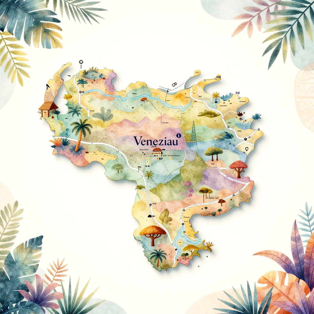 Venezuela map drawing illustrated with pastel color palette, delicate hand-drawn roads, rivers and cities, surrounded by tropical flora and fauna motifs, soft gradients enhancing geographical features, artistic borders with Latin American cultural symbols, elegant and warm.