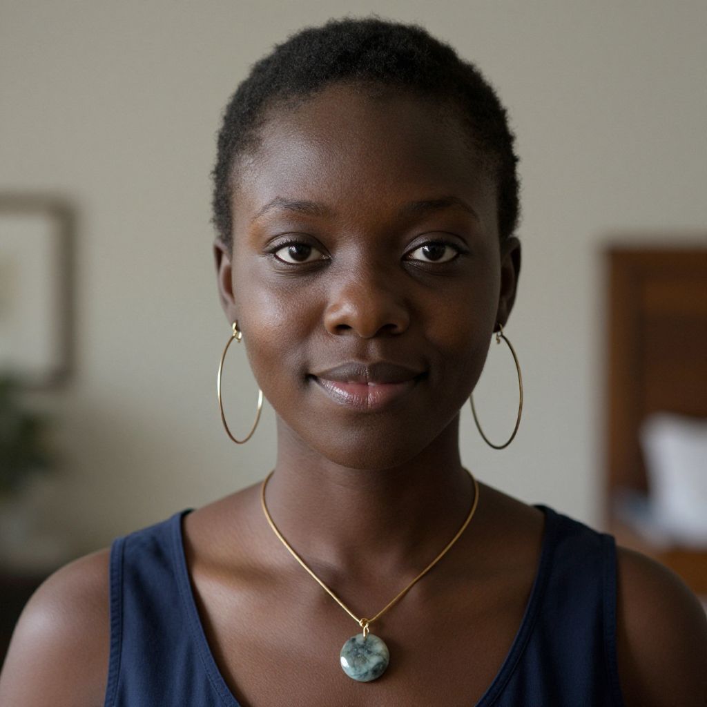 Photograph of a young African woman with dark skin and short, natural hair, wearing a sleeveless, navy blue top. She has large, gold hoop earrings and a gold necklace with a circular, turquoise stone pendant. Her expression is calm and slightly smiling, with glossy lips. The background is blurred, showing a beige wall, a framed picture on the left, and a wooden door on the right. The lighting is soft, highlighting her smooth skin and subtle makeup. The overall style is realistic and natural.