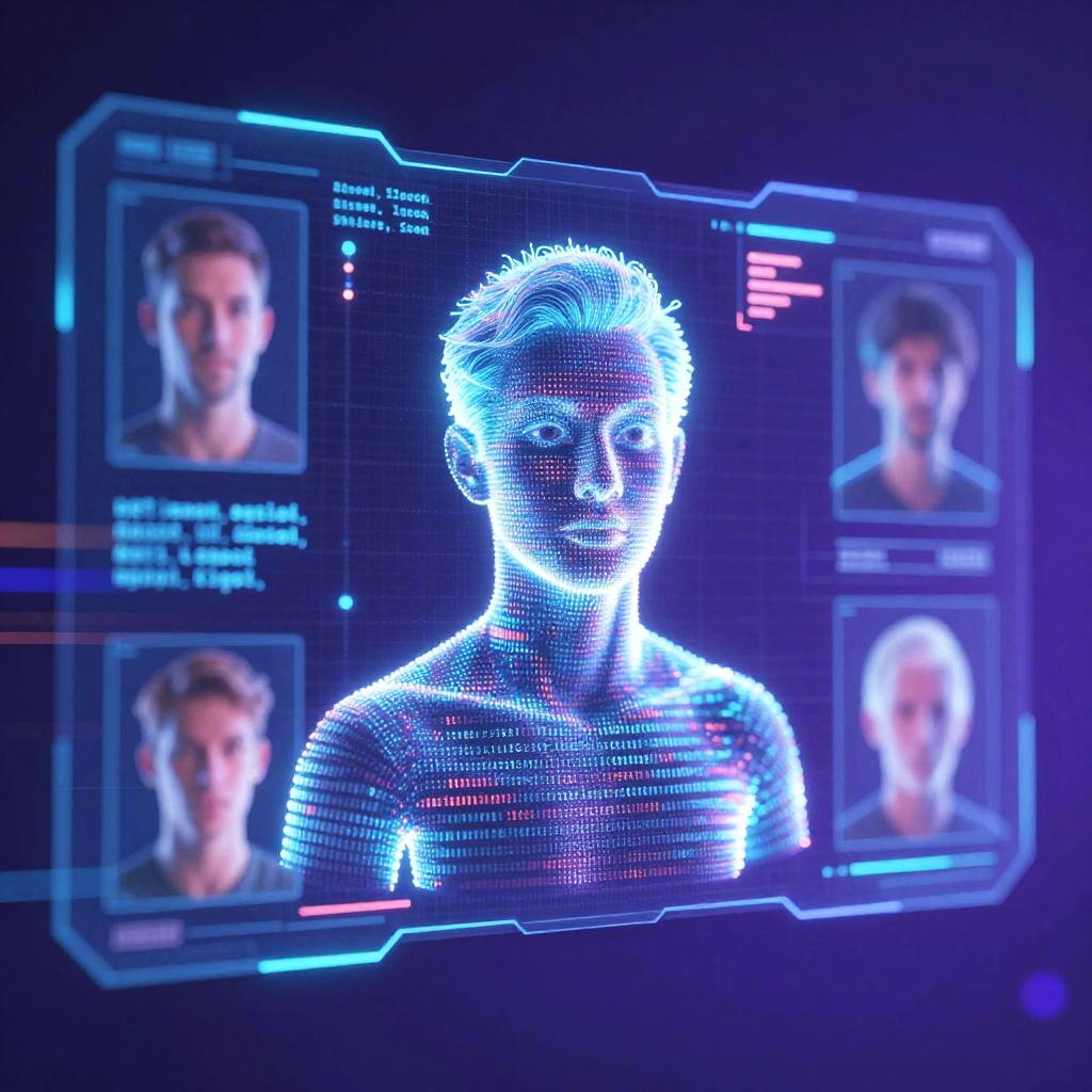AI avatar generator from text inspired scene, a holographic user interface displaying multiple avatars formed from different text prompts, glowing graphs and codes in the background, deep purple and blue tones, digital art, immersive environment