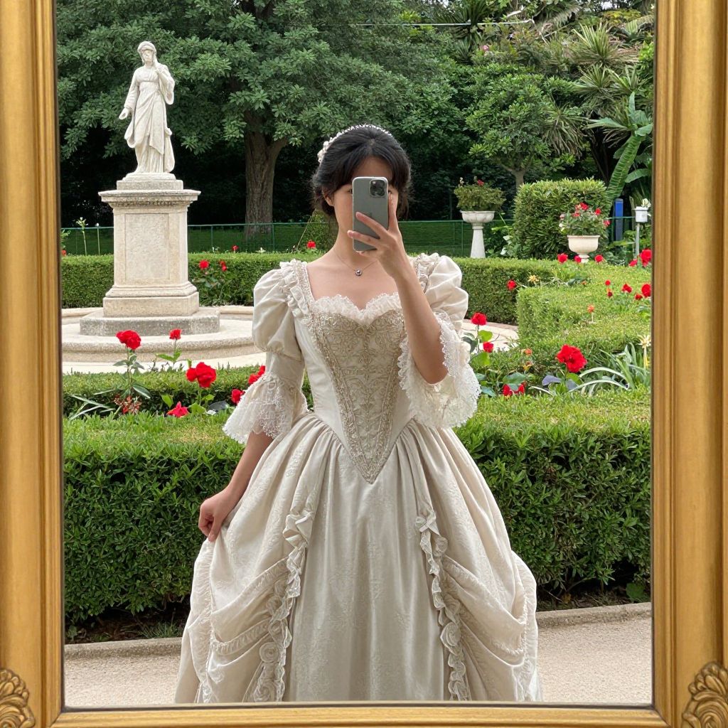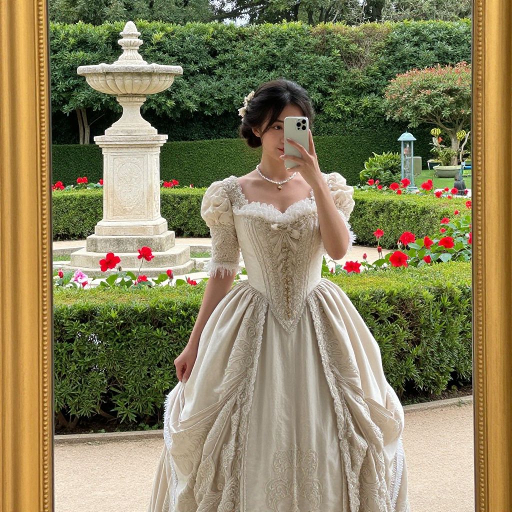 Woman in an ornate cream gown takes a selfie in a gold-framed mirror, reflecting a lush garden with manicured hedges, vibrant red flowers, and a classical stone monument to her left.