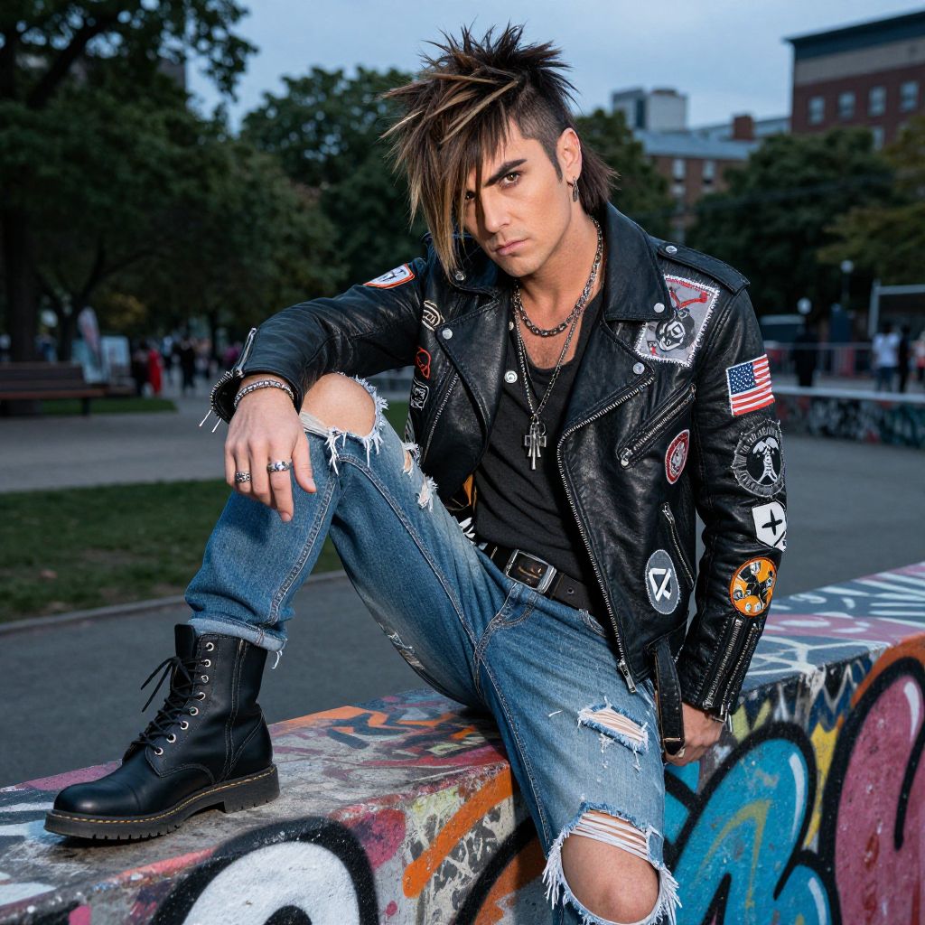 A confident male with an edgy hairstyle male consisting of a layered, wild fringe with deep brown roots and sharp angles, wearing a punk-inspired costume with ripped denim, combat boots, and a ripped leather jacket adorned with patchwork symbols, posing on a graffiti-covered wall in a city park during dusk, angular face, thick eyebrows, and a defiant look.