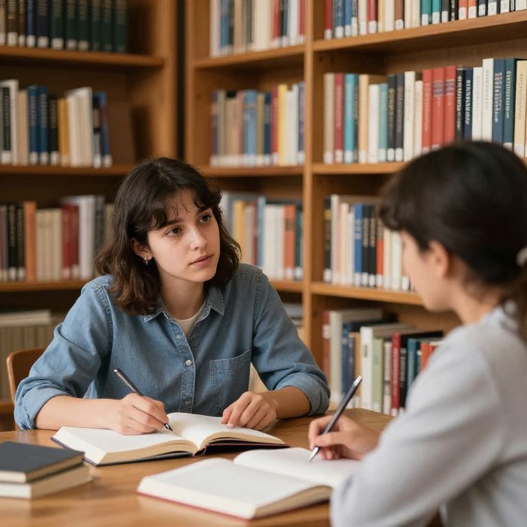 Photograph of two young adults with medium-length dark brown hair, seated at a wooden table in a library. The woman on the left, wearing a blue denim shirt, is writing in an open book with a pen, looking focused. The man on the right, in a white shirt, is writing in another book with a pen, partially turned away. The background features tall wooden bookshelves filled with variously colored books. The table has another closed book and a stack of papers. The lighting is natural, enhancing the warm, scholarly atmosphere. Both individuals have fair skin and a serious expression.