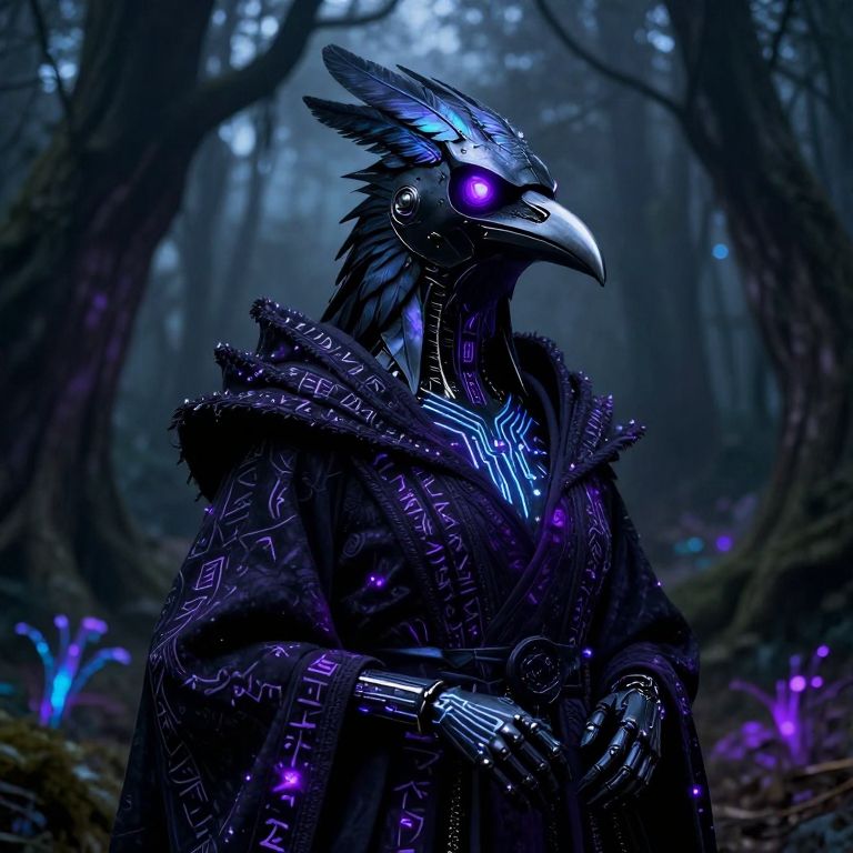 A hyper-realistic photo of a humanoid figure wearing a cybernetic raven-themed helmet, blending matte black metal with iridescent synthetic feathers, The helmet features glowing violet lenses resembling a raven’s piercing eyes, with a sharp chrome beak, The figure is cloaked in a shadowy, rune-etched garment, woven with luminescent threads that pulse with a dark purple hue, Beneath the garment, visible on the figure’s neck and hands, are circuit-like tattoos that pulse with electric blue energy, seamlessly integrating with the high-tech design, The background of the photo is a dark, misty forest at night, with towering, twisted trees and bioluminescent plants casting an eerie light, The figure stands as a sentinel, exuding an aura of dark wisdom and arcane power, in a world where technology meets ancient magic, aiai-3v4