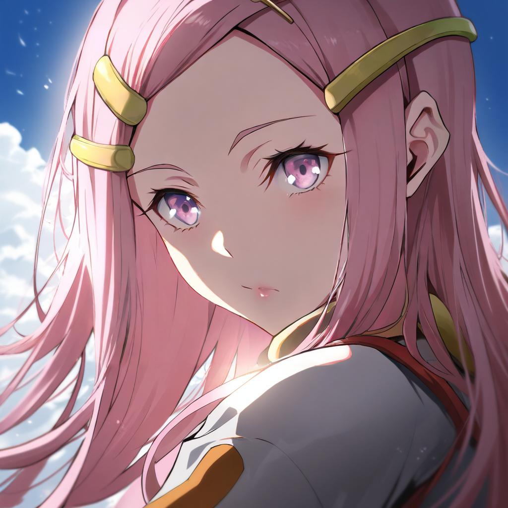 Digital anime-style illustration of a young girl with long pink hair and purple eyes. She wears gold hair clips and a white outfit with orange and black details. The background shows a partly cloudy blue sky with sunlight highlighting her features.