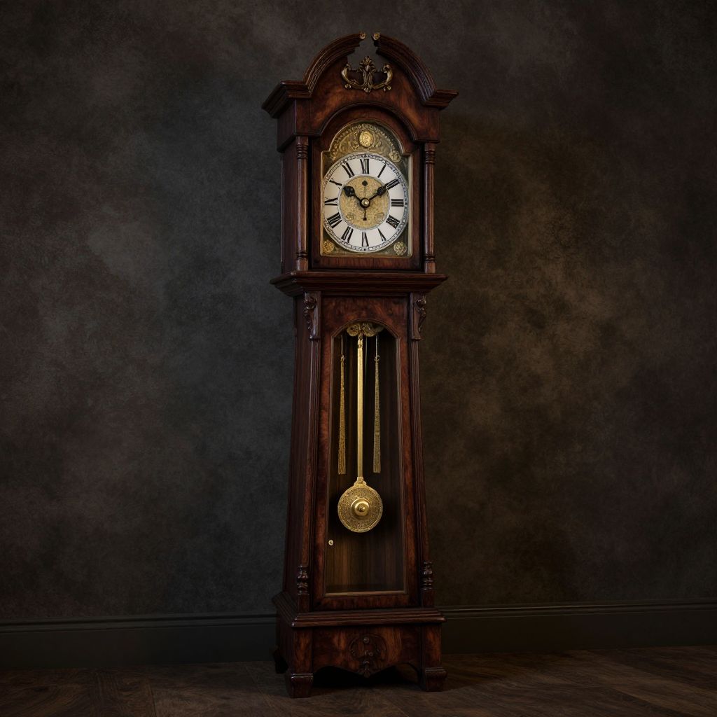 An intricately crafted 3D-rendered grandfather clock, featuring a vintage aesthetic with dark wood detailing and a gold pendulum, stands against a moody, textured backdrop, evoking a sense of timeless elegance and mystery.