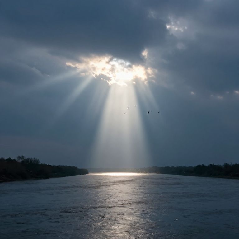A luminous beam of light pierces the heavens, drawing birds toward its radiant source as a serene river stretches endlessly into the horizon, defying gravity and expectation.