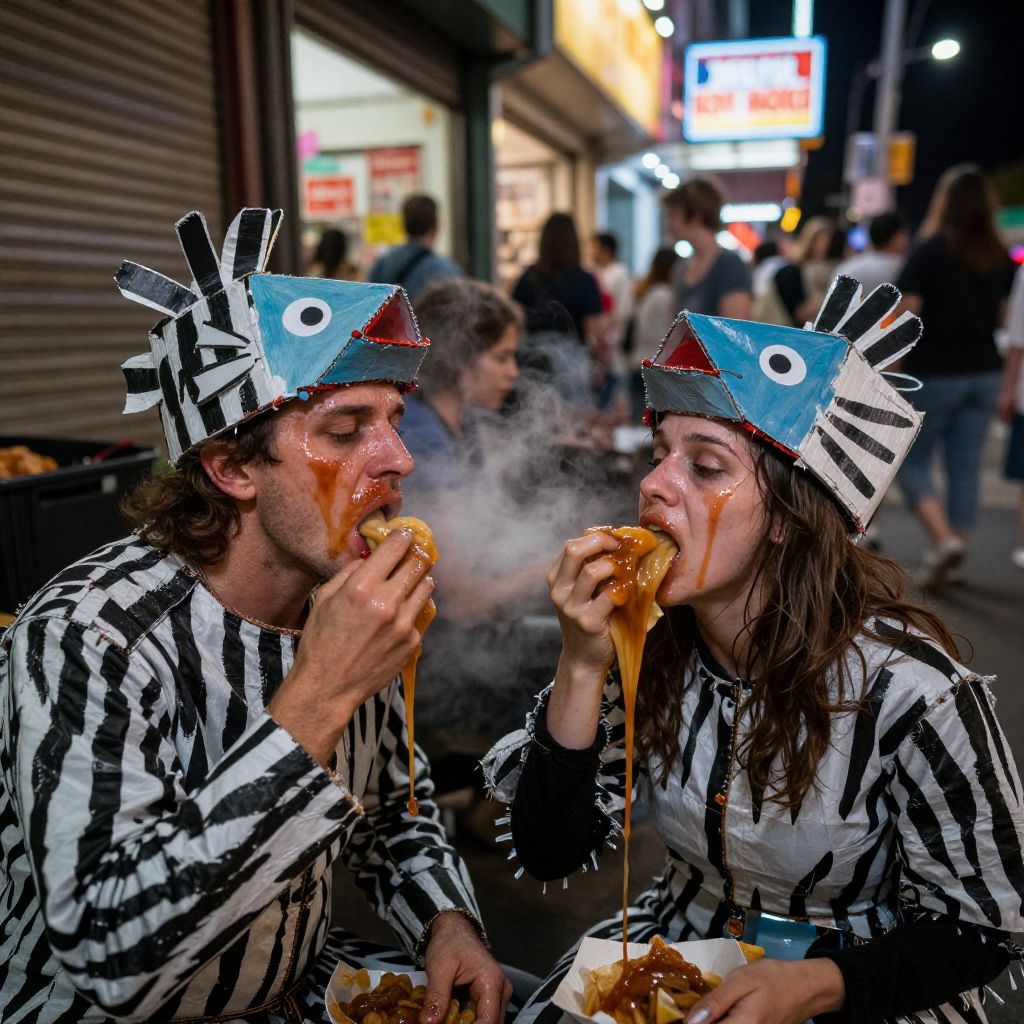 An award winning genre defining documentary mid-close-up photograph, hi lighting the plight of mentally ill people, A man and a woman both with disturbing features, they societies rejects, cramming disgusting food into their mouths, in a gluttonous frenzy, their greasy faces covered in sauces and grease from the food. They wearing cheap poorly made zebra costumes, hand made, paper mache, fish head helmets, while sitting outside of a sleazy adult bookstore, crowded with pedestrians in the background, cinematic still, night street photography style, long exposure, open shutter, double exposure, neon light, steamy atmosphere, Leica M3, 50mm lens
