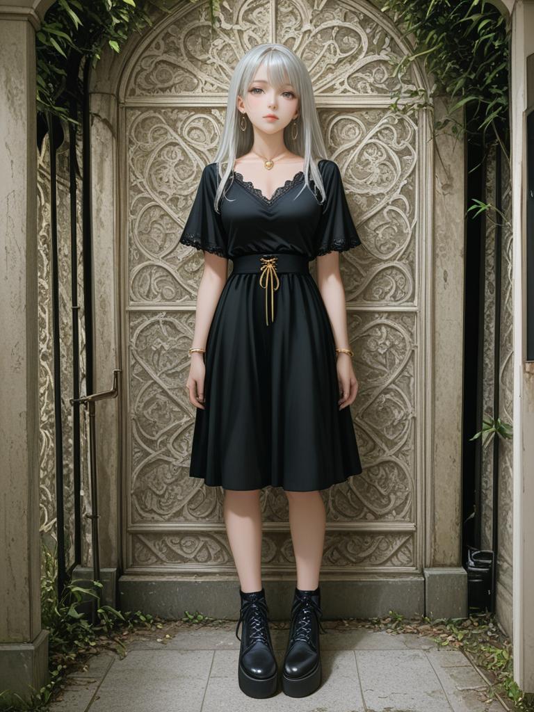 1girl, realistic face, full body shot, Woman, casual chic, black short-sleeve top with a lace-up V-neckline featuring silver eyelets and laces, relaxed fit, plain fabric, simple gold hoop earrings, natural makeup, photo studio background