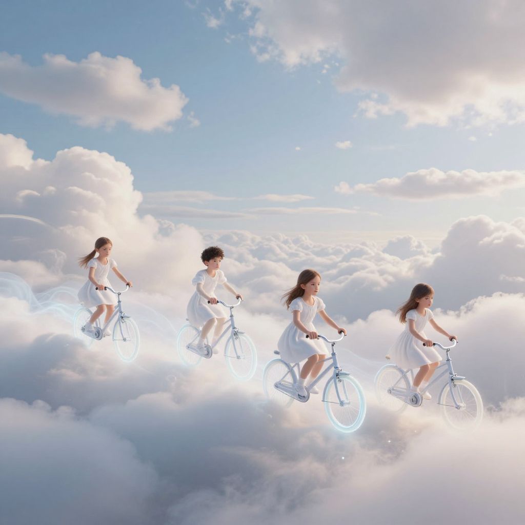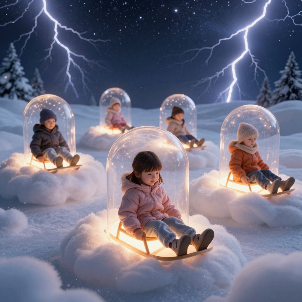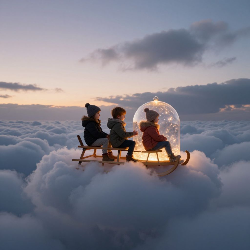 Through the ethereal veil of twilight, children drift serenely on sleds cradled by thunderclouds, their glass domes aglow with the warmth of cherished memories, illuminating the boundless expanse of imagination and the timeless pursuit of wonder.