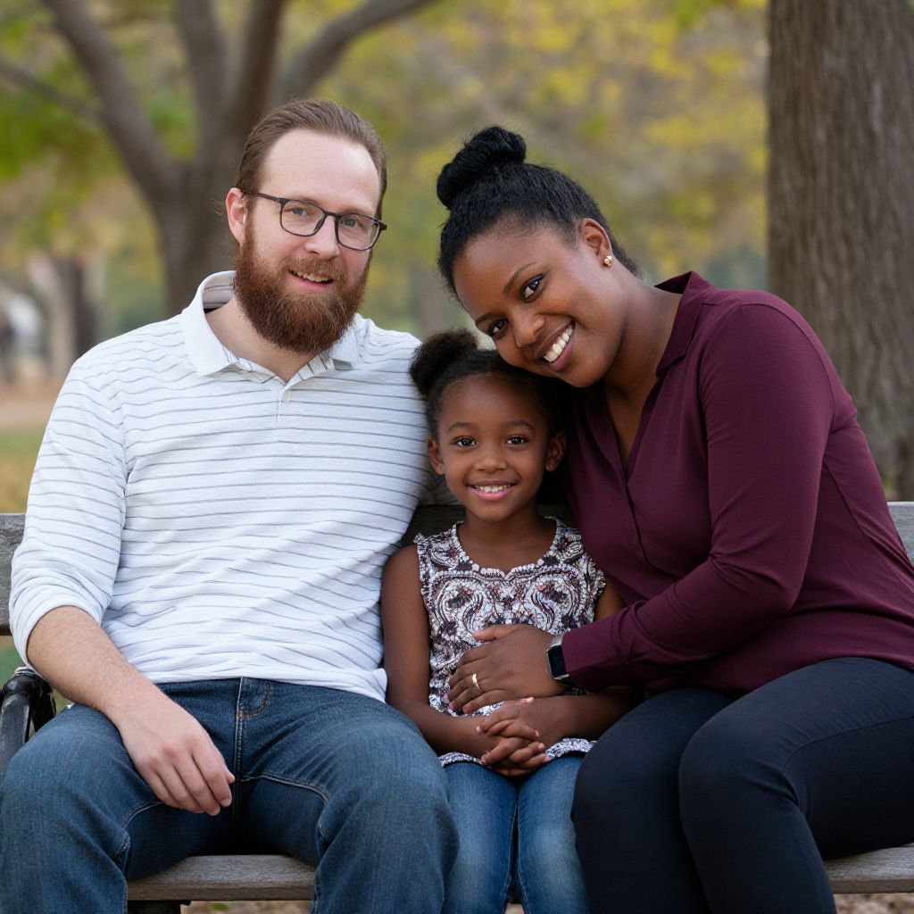 A photograph of a happy family of three sitting on a wooden bench in a park. A bearded white man with glasses, wearing a white striped shirt, sits on the left. A Black woman with a bun, in a maroon shirt, leans forward, smiling, with a young Black girl, wearing a patterned top, nestled between them. The background shows blurred autumn trees.