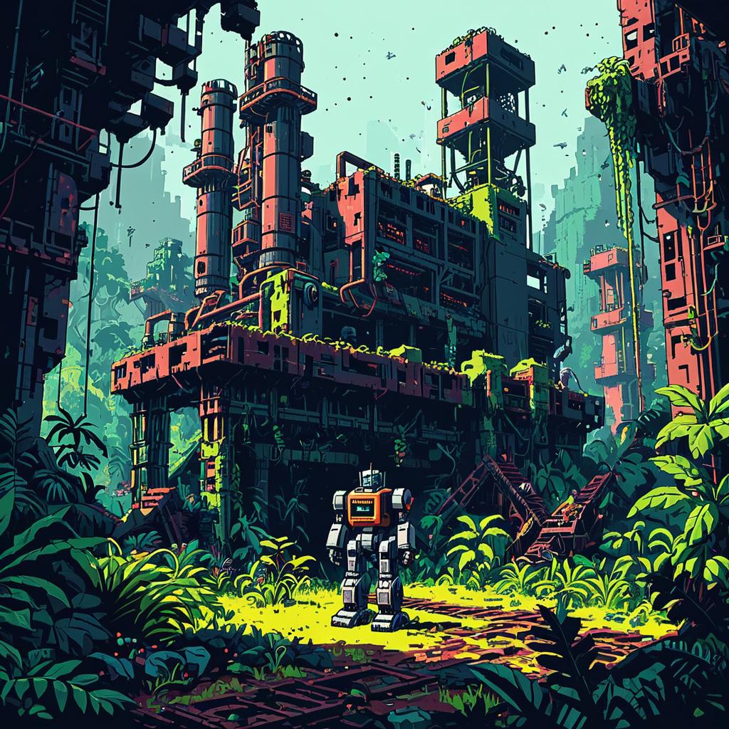 Pixel art landscape of a ruined robot factory engulfed by jungle, vibrant colors, artstation, deviantart, 8-bit game concept art
