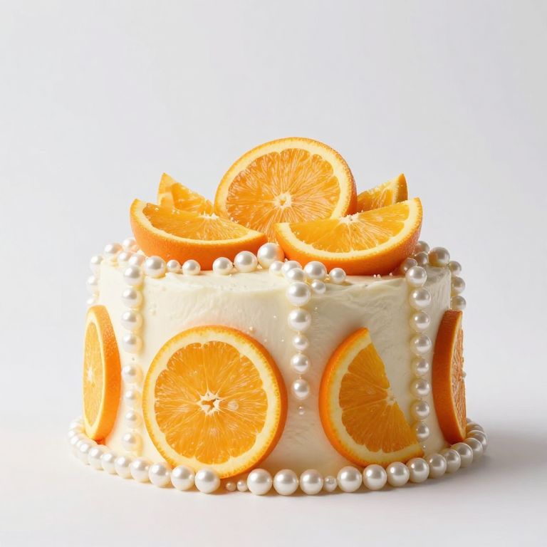 A whimsical cake adorned with vibrant orange slices and cascading white pearls defies gravity, creating a surreal, dreamlike tableau where nature and confectionery merge in perfect harmony.