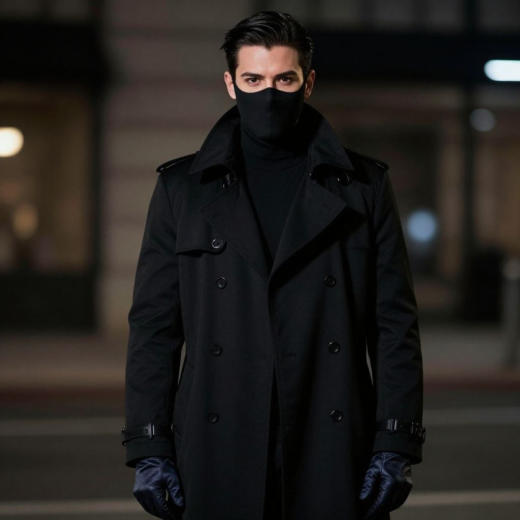 Photograph of a mysterious man in a black overcoat and mask, wearing black gloves, standing in a dimly lit urban night scene. Intense