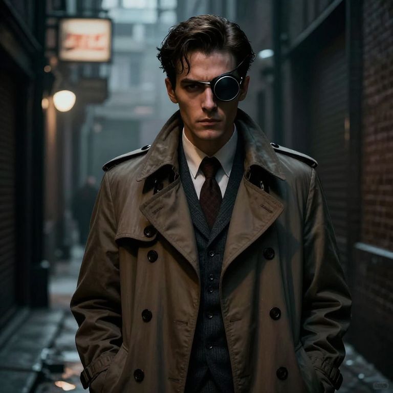 Photograph of a man with dark, slicked-back hair and intense blue eyes, wearing a black, double-breasted overcoat with large buttons, and a black face mask that covers his nose and mouth. He also wears black gloves. The background is blurred, showcasing dark, urban streetlights and indistinct buildings, creating a moody, nighttime atmosphere. The man's stern expression and shadowed face contribute to a mysterious and dramatic effect. The image uses high contrast and sharp focus on the subject, highlighting his enigmatic presence.