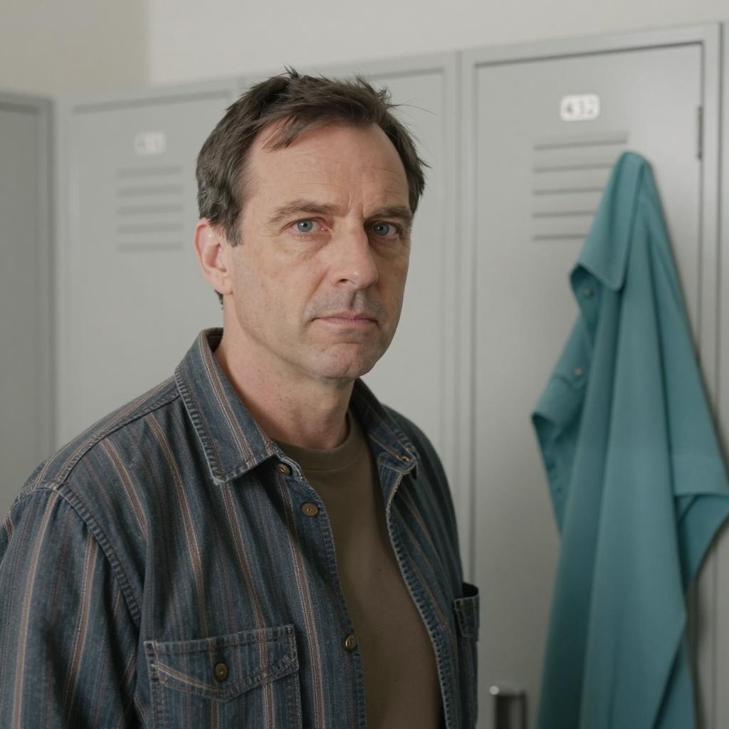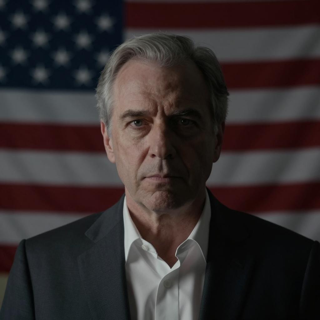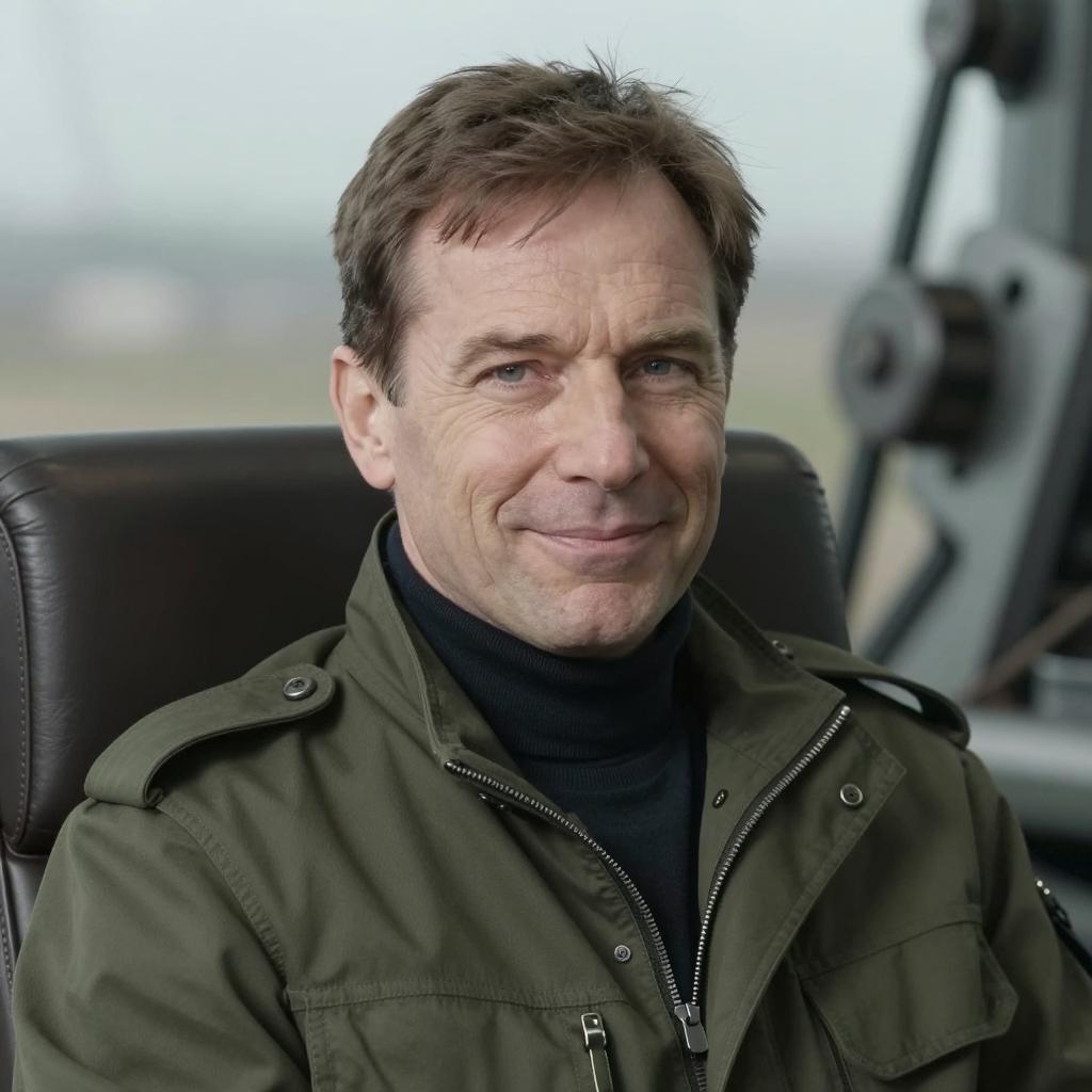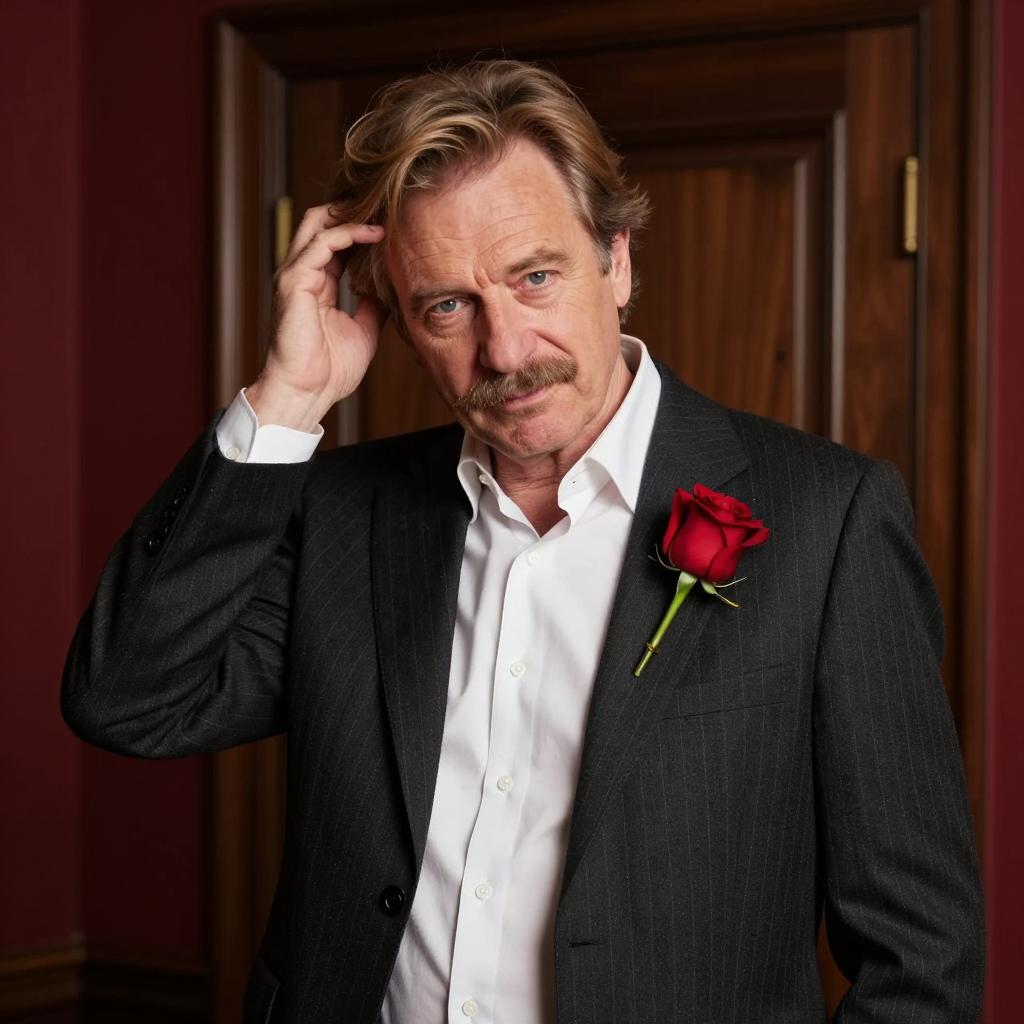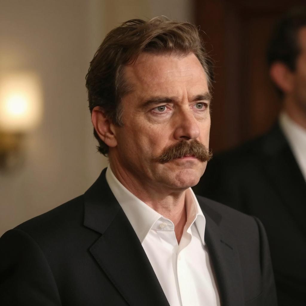 A middle-aged man with light skin, short brown hair, and a thin mustache. He has green eyes and a slight smile. He wears a brown shirt with a yellow collar. The background is dark. The man is turned to the right, looking over his shoulder. His expression is calm and focused.