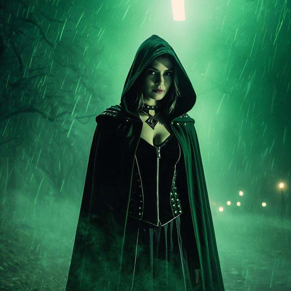 A mysterious young woman wearing a dark green hooded cloak and a studded choker stands in a foggy environment illuminated by eerie greenish light. She wears a black corset with silver studs and a zipper, along with dark clothing. The scene features soft glowing ambient background lighting and falling rain, creating a moody, dramatic atmosphere reminiscent of comic book style sharp line art.