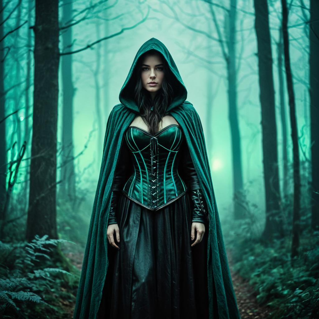Mysterious Woman in Hooded Cloak in Foggy Green Light