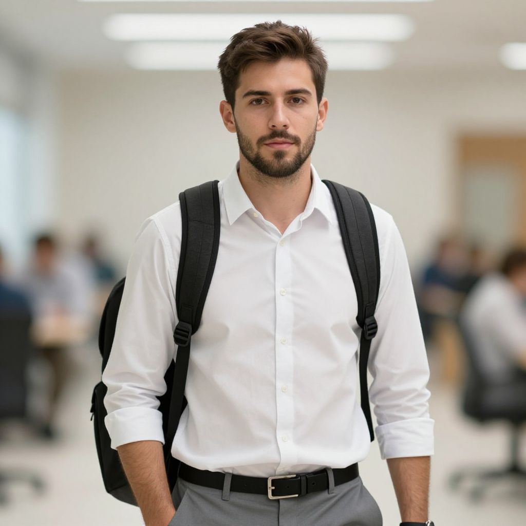 Man casual office attire, 1boy, male focus, solo, shirt, facial hair, blurry background, collared shirt, realistic, short hair, blurry, backpack, bag, brown hair, looking at viewer, beard, indoors, white shirt, pants, grey shirt