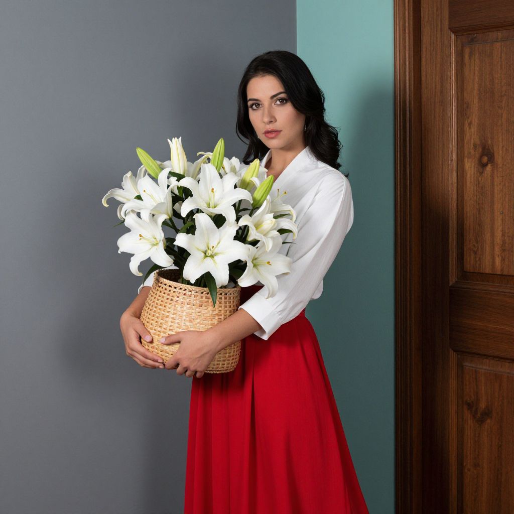 Photograph of a brunette woman with fair skin, wearing a white blouse and red skirt, holding a woven basket filled with white lilies, standing beside