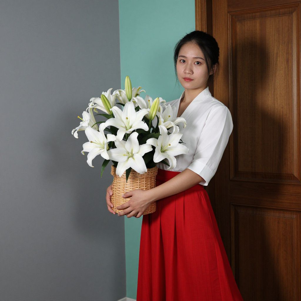 Woman holding a woven basket filled with vibrant white lilies and green buds, dressed in a crisp white blouse and flowing red skirt, stands gracefully against a dual-toned backdrop of gray and teal walls, casting a subtle shadow on the adjacent wooden door.