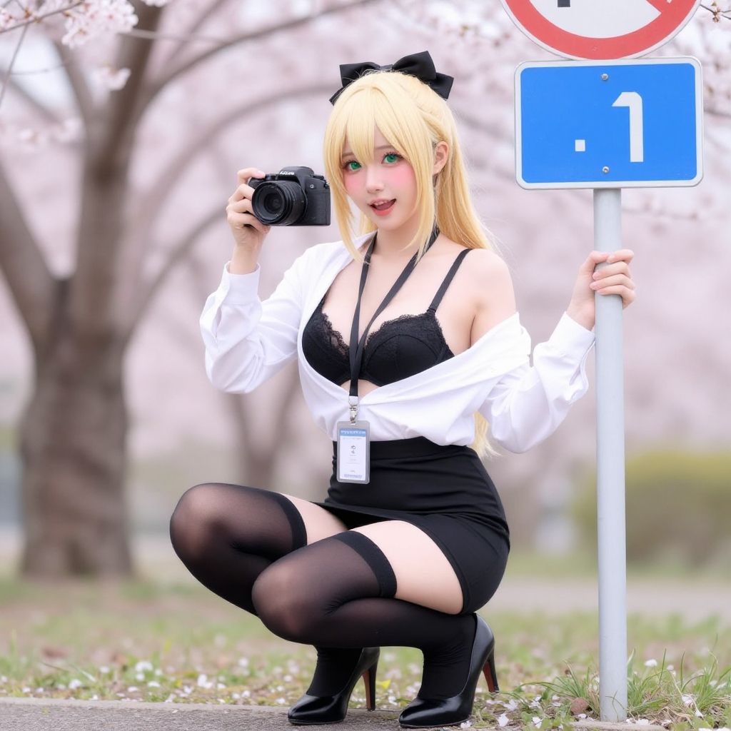 1girl, underwear, solo, squatting, panties, blonde hair, green eyes, breasts, holding camera, camera, bow, holding, hair bow, ponytail, looking at viewer, outdoors, cleavage, open mouth, shirt, lanyard, sign, smile, white shirt, skirt, black bra, bra, black panties, cherry blossoms, :d, pantyshot, black bow, blush, thighhighs, bangs, long sleeves, long hair, high heels, black skirt, virtual youtuber, road sign, id card, pencil skirt, full body, medium breasts, tree, black thighhighs