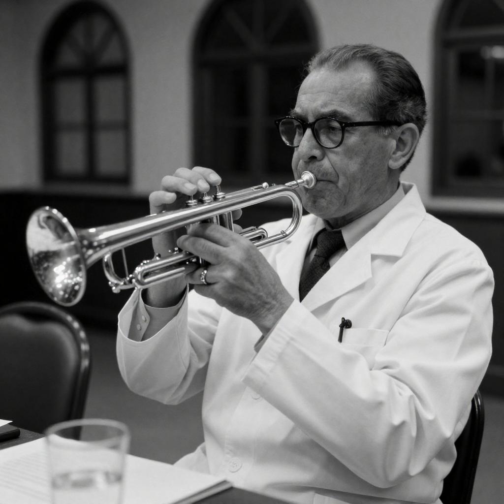 Black-and-white photograph of an older man with glasses, wearing a white lab coat, blowing into a trumpet. He sits at a table with a chair and glassware. Background includes dark, arched windows. Intense, focused expression.