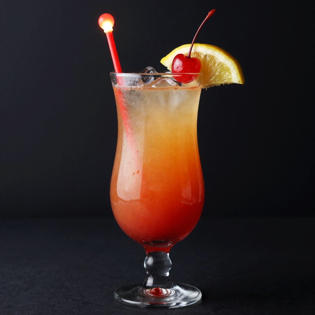 A vibrant photograph of a tropical cocktail with a bright yellow-orange drink, garnished with a pineapple wedge, a red cherry, and a green leafy sprig. Two orange straws are inserted into the drink. The background is a deep red, creating a striking contrast with the drink's colors. The glass has a slightly curved shape, adding a stylish touch. The lighting emphasizes the drink's refreshing appeal.