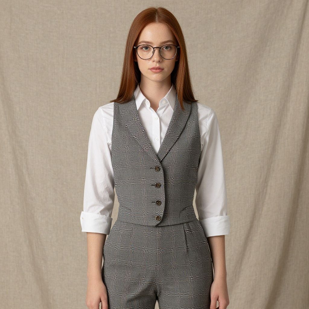 Photograph of a young Caucasian woman with straight, shoulder-length brown hair and fair skin, wearing round glasses. She is dressed in a white button-down shirt with the sleeves rolled up to her elbows, and a gray, checkered, tailored vest and matching trousers. The background is a plain, beige fabric that provides a neutral contrast to her outfit. Her expression is neutral, and she stands facing the camera, centered in the frame. The overall style is professional and polished.