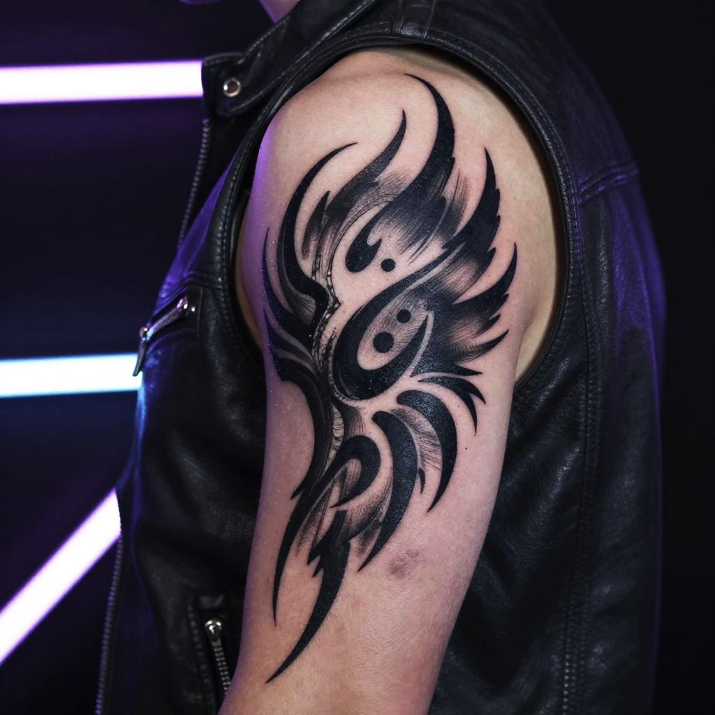 Photograph of a muscular male arm adorned with a bold, black tribal tattoo. The tattoo features intricate, swirling designs with pointed tips and circular accents, covering the entire upper arm. The person is wearing a black, sleeveless leather jacket, and the background is dark with bright white neon lines, adding a modern, edgy contrast. The tattoo has a glossy, fresh appearance, highlighting the artist's precision and style. The skin tone is light, and the arm is positioned at a slight angle, emphasizing the tattoo's detail and complexity.