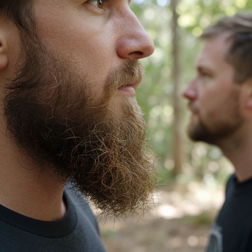 Close-up photograph of two bearded men in profile, one with a thick brown beard and the other with a trimmed beard, outdoors with a blurred forest