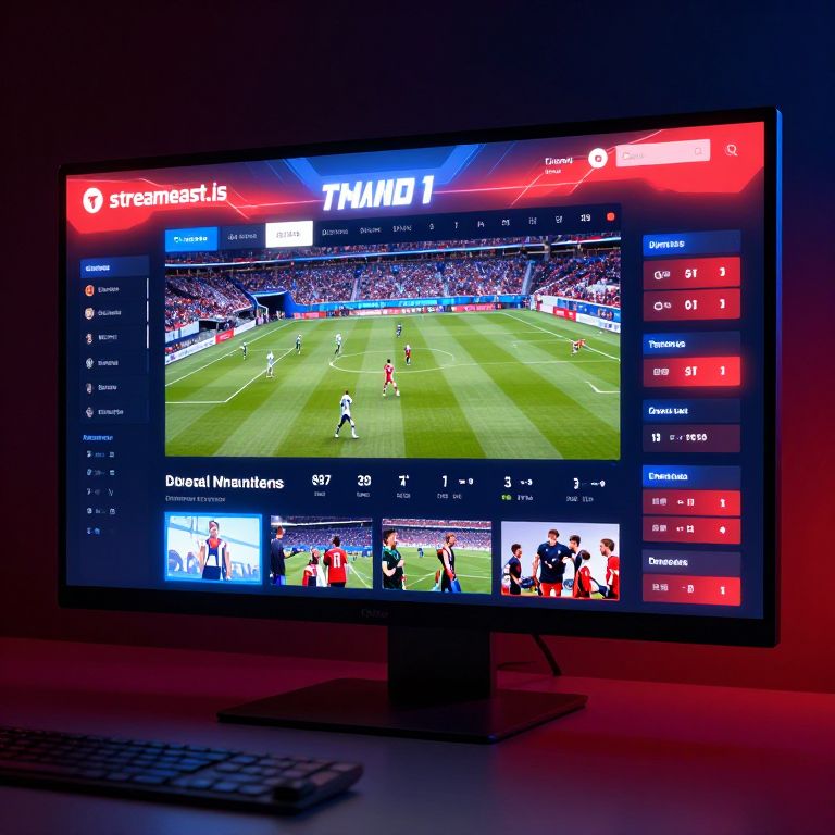 Streameast.is sports streaming site presentation, dynamic live game interface with stats and scoreboards, energetic color palette of reds and blues, futuristic HUD elements, immersive user experience, digital rendering with vibrant details