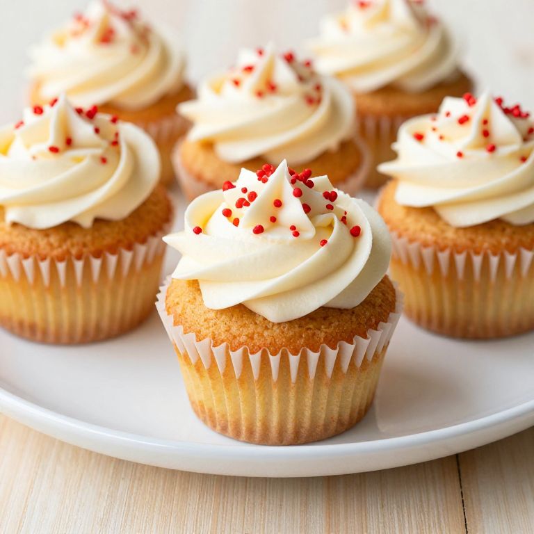 Photograph of six vanilla cupcakes with swirled white frosting, each adorned with small red cherry sprinkles. The cupcakes are in white paper liners and arranged on a plain white plate. The background is a light wooden surface, adding a rustic feel. The cupcakes are golden-brown with a moist texture, and the frosting is creamy and smooth. The red sprinkles provide a vibrant contrast to the white frosting and brown cupcakes. The image is brightly lit, highlighting the textures and colors.
