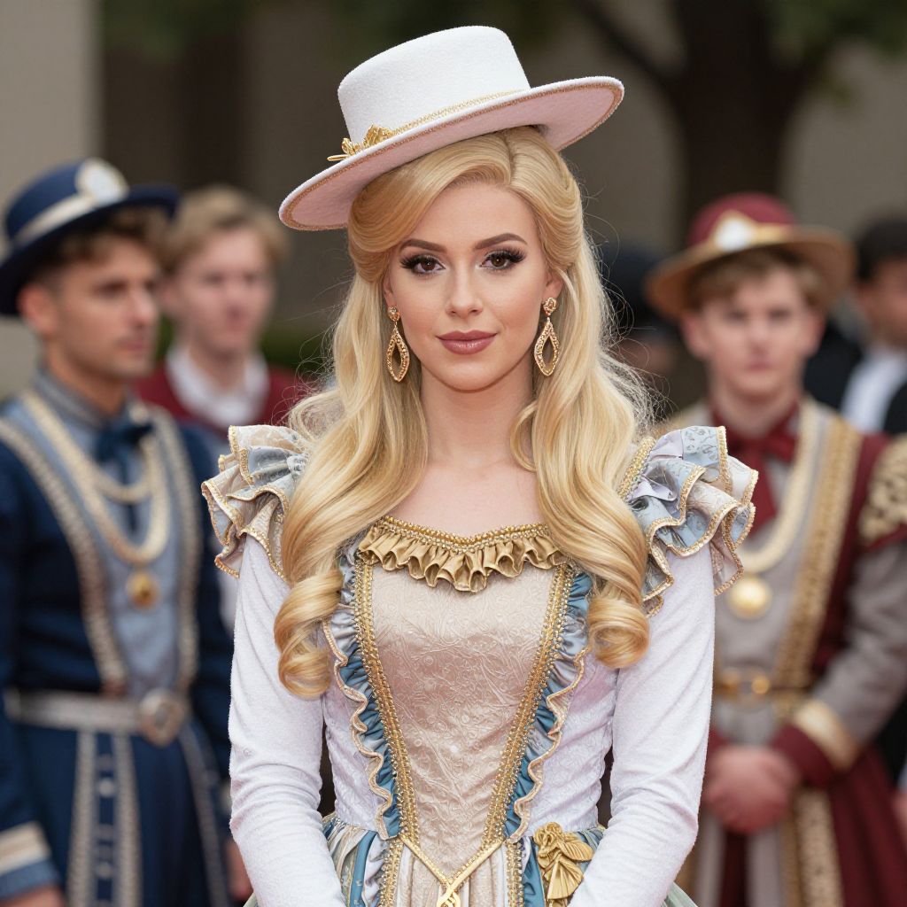 Photograph of seven young women with fair skin, wearing golden and burgundy medieval-style dresses, standing in front of a wooden arch adorned with autumn leaves