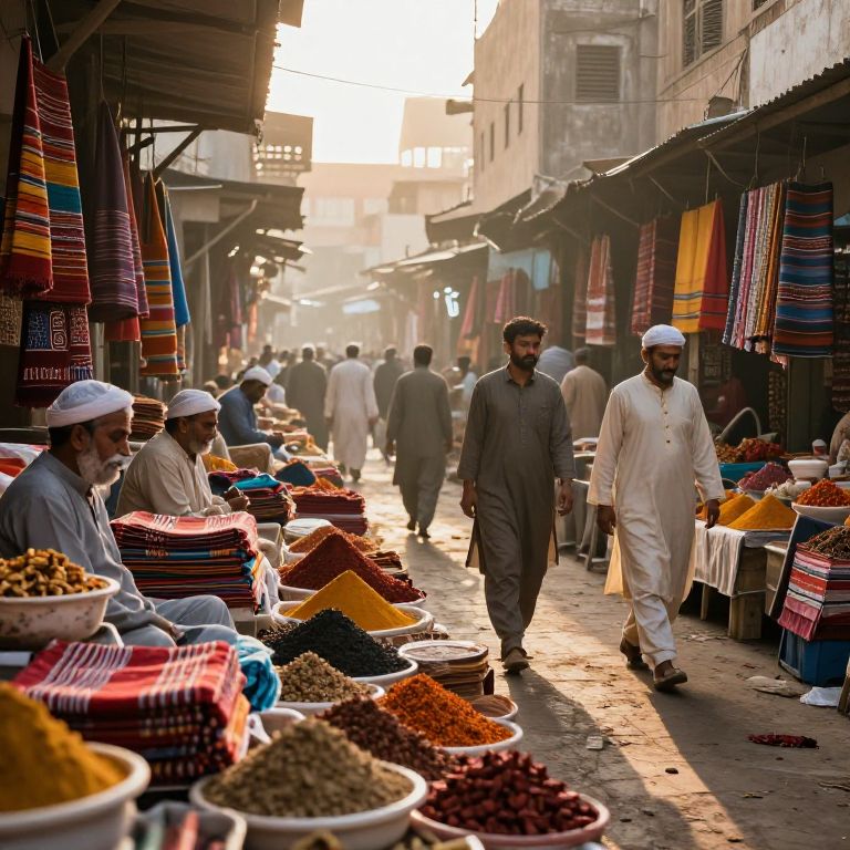 Prompt Pakistan: A bustling marketplace in Karachi at sunrise, rich in textures and colors, local vendors selling hand-woven fabrics and spices, warm golden lighting, detailed MidJourney style.