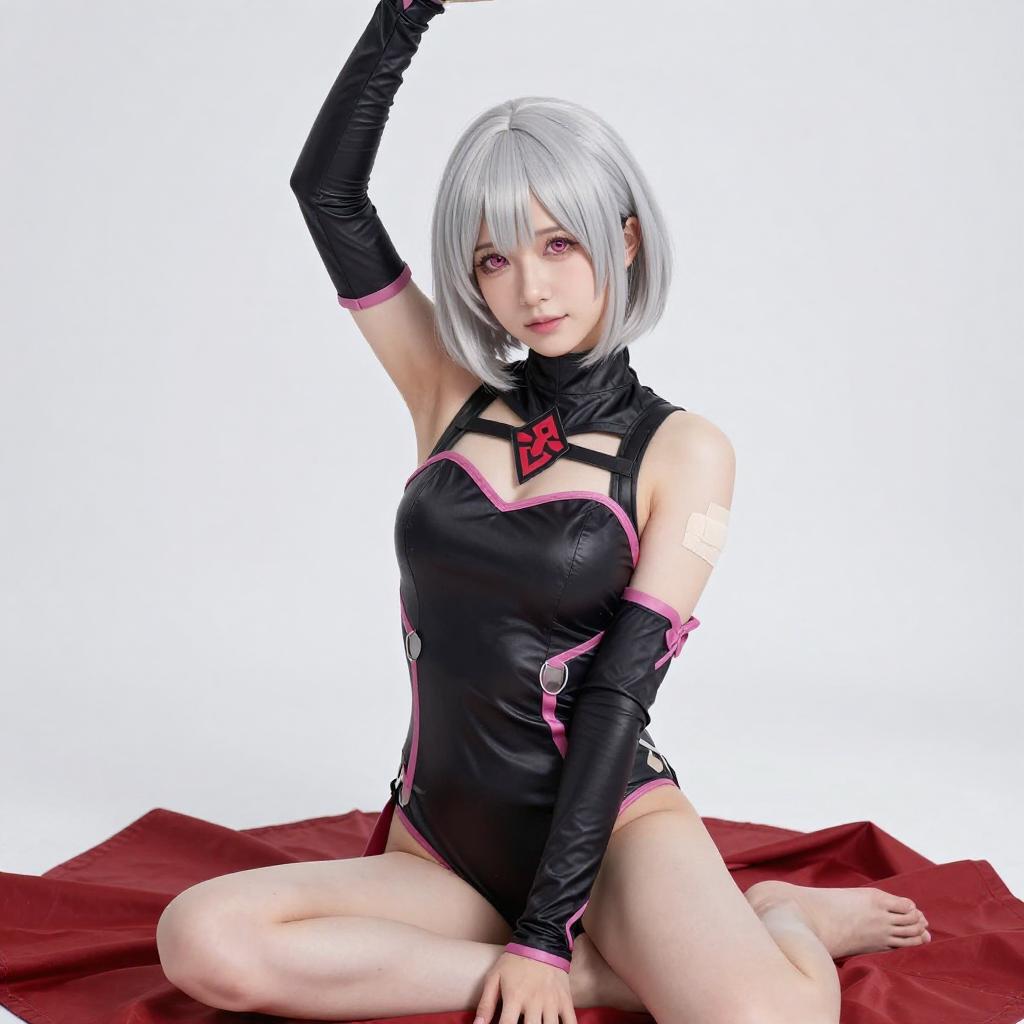 Photograph of an anime-style cosplayer with silver hair, pink eyes, and fair skin. She wears a black and red kimono with white bandages on her right arm and hand. She is kneeling, reaching forward with her right hand, and has a small white bandage on her left shoulder. The background is plain white.