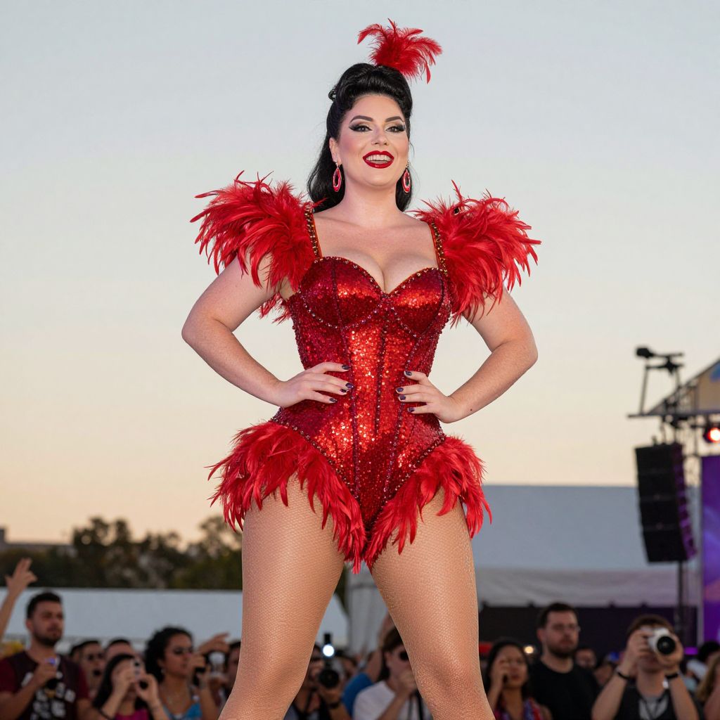 Photograph of a fair-skinned woman with dark hair styled in a high bun, adorned with a red feather. She wears a red, sequined, feathered bodysuit with a low neckline, highlighting her ample cleavage. Her legs are covered in shimmering tights. She stands confidently with hands on hips, smiling at the camera. The background shows a twilight sky with a crowd of people, some holding up phones, capturing the moment. Large stage lights are visible on the right. The overall vibe is festive and glamorous, with vibrant red feathers contrasting against the soft evening light.