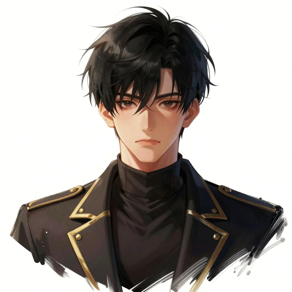 Digital anime-style portrait of a serious young man with red hair, wearing a green jacket with red stripes, against a dark blue gradient background.