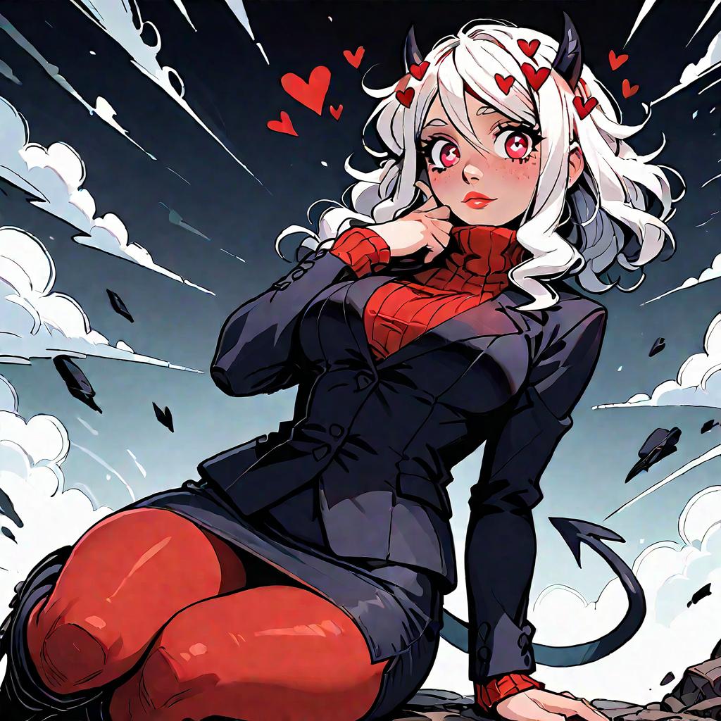 Score_9, score_8_up, score_7_up, score_6_up, score_5_up, score_4_up, source_anime, 1girl, solo, looking at viewer, white hair, red eyes, horns, demon girl, modeus \(helltaker\), heart-shaped pupils, floating hearts, red turtleneck, black jacket, pencil skirt, red pantyhose, black boots
