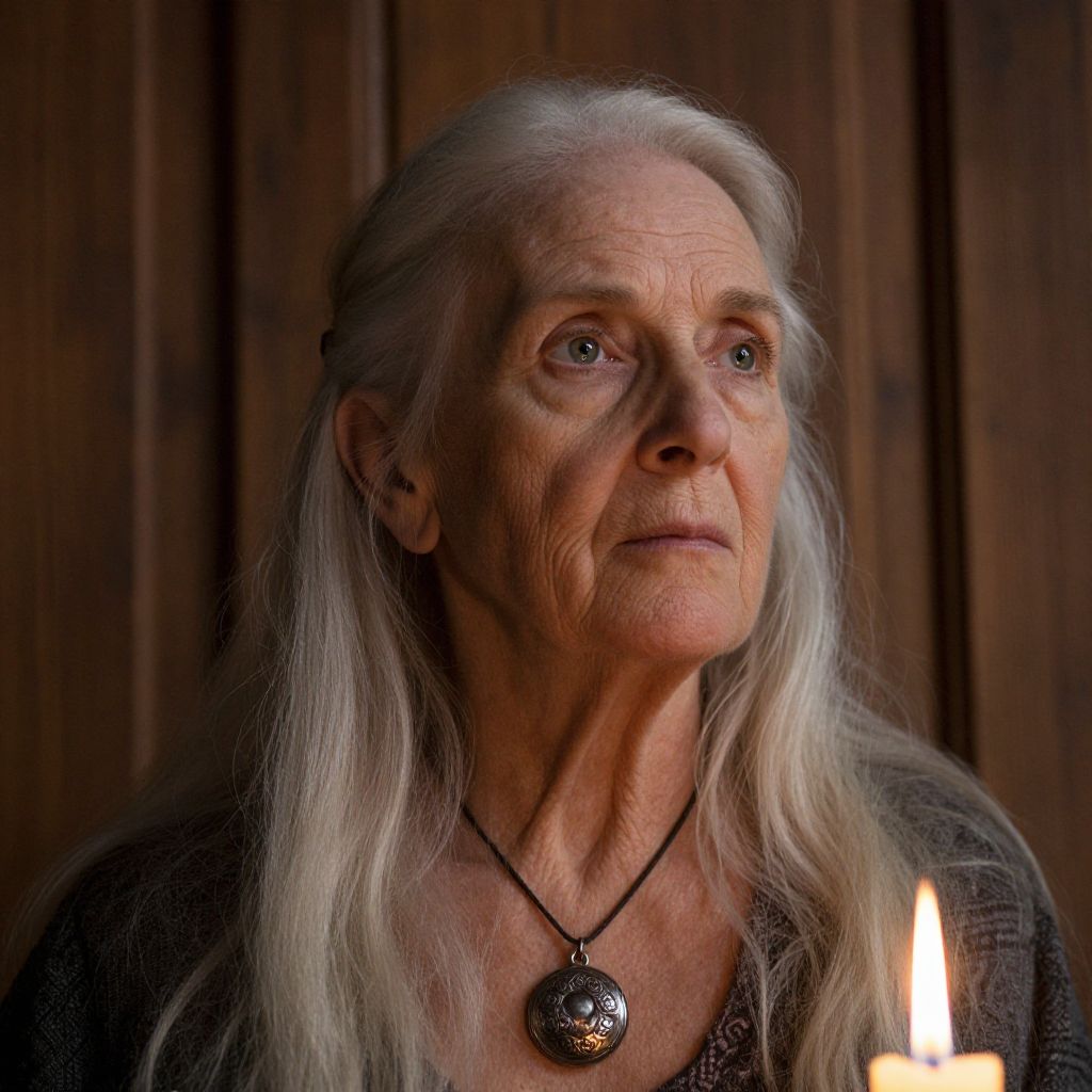 Photograph of an elderly woman with long, white, slightly wavy hair and deep wrinkles on her face, wearing a dark, textured sweater. She has fair skin and blue eyes, and is wearing a black cord necklace with a round, metallic pendant. Her expression is serious and contemplative. A small, lit candle is visible to her right, casting a warm glow on her face. The background consists of dark, wooden panels, adding a rustic and somber atmosphere to the image. The lighting emphasizes her facial features and the texture of her skin.