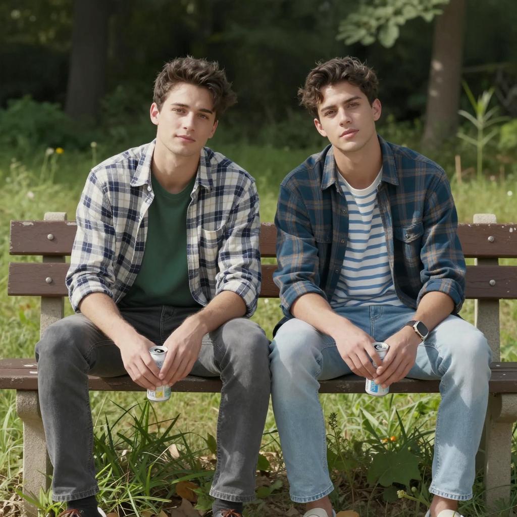 Two men sitting outdoors. The man on the left is shirtless, muscular, with wet, curly brown hair, and a neutral expression. The man on the right has dark hair, wears a white tank top, a checkered shirt, and a gold necklace, holding a cigarette, looking to the side. Background includes greenery and a pink house.